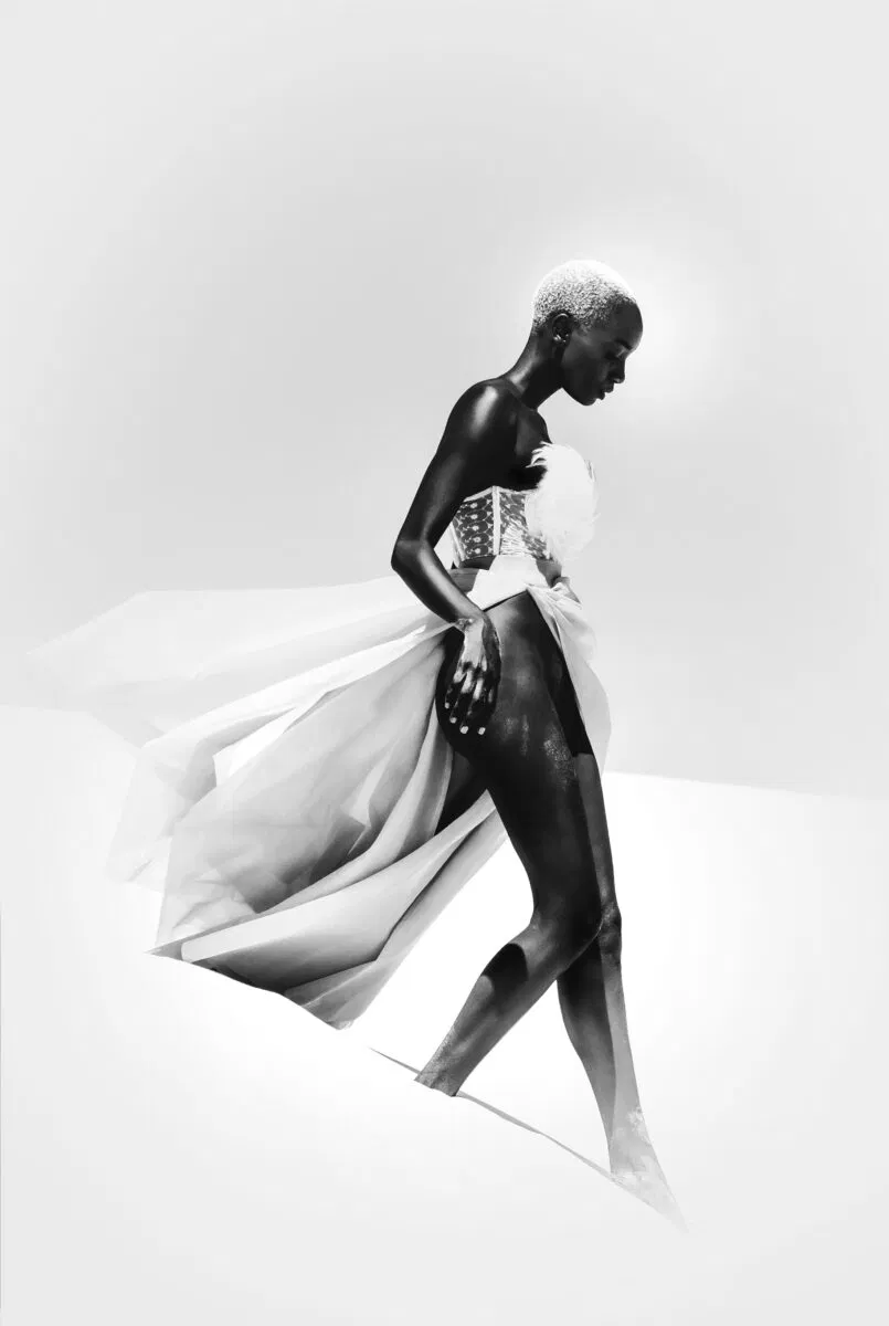 "L'immagine è intitolata "Su my way” e sembra l'inizio di una storiami piacerebbe guardare svelare. Cosa ci fa questa donna sorprendente, con il corsetto e seminuda, che cammina con l'acqua fino alle caviglie nel bel mezzo del nulla? Ci sono così tante cose che mi piacciono: , il sottilmente diverse tonalità di bianco (sabbia, cielo, vestiti, capelli); l'uso magistrale dello spazio negativo; la sottile ma netta demarcazione tra sabbia e cielo; il modo in cui la luce e la sabbia giocano sulla sua pelle; , il forte Linee delle sue gambe; come l'angolazione del suo collo lungo e forte richiama esattamente quella della sua gamba destra; l'ombra sottile sotto qui; quelle balze regali; il senso di forza e morbidezza; la mancanza di qualsiasi spunto di riferimento (la didascalia ci dice che siamo fuori Città del Capo, ma potremmo essere su un altro pianeta). Dov'è stata? Dove sta andando? Voglio saperlo."— Bill Shapiro